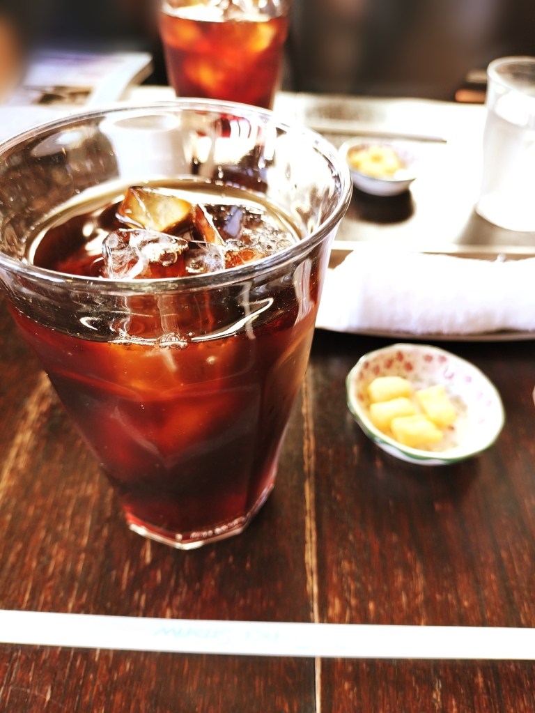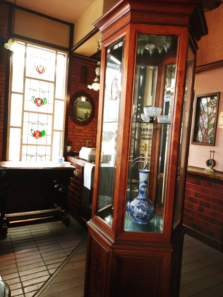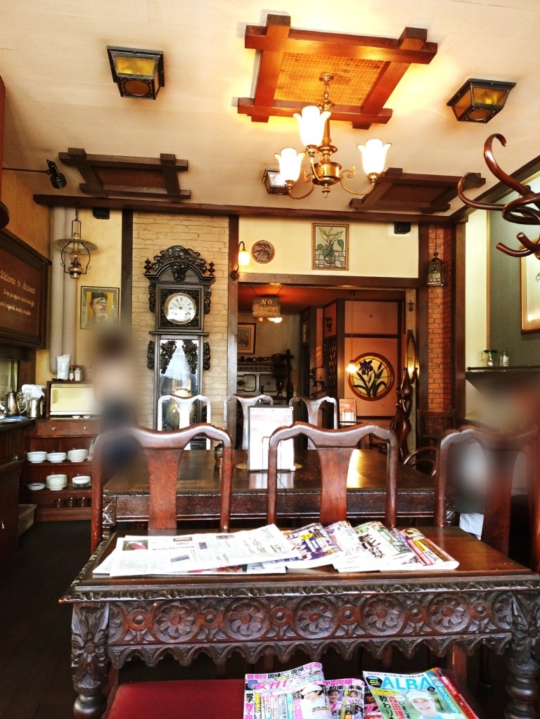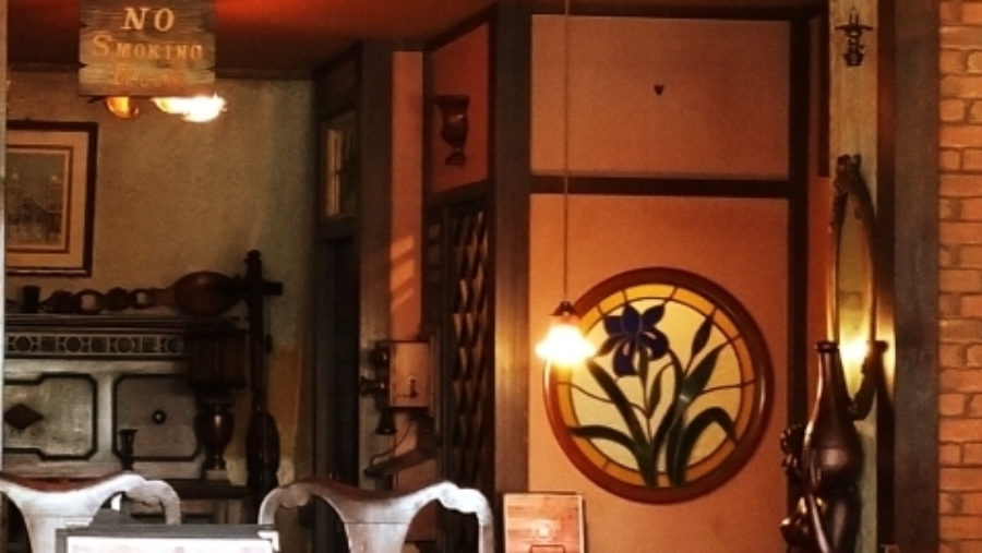 創業から40年あまり経つ老舗で、明治のようなお洒落でレトロな雰囲気を漂わせています。木の香りが漂う店内は、まるで時間が止まったかのように静かで、落ち着いた空気が流れています。アンティーク家具が至るところに配置されており、暗めの照明が窓から差し込む柔らかな光を引き立て、その光がステンドグラスを通して幻想的な雰囲気を醸し出しています。フェイクではないのがとても貴重だと感じました。