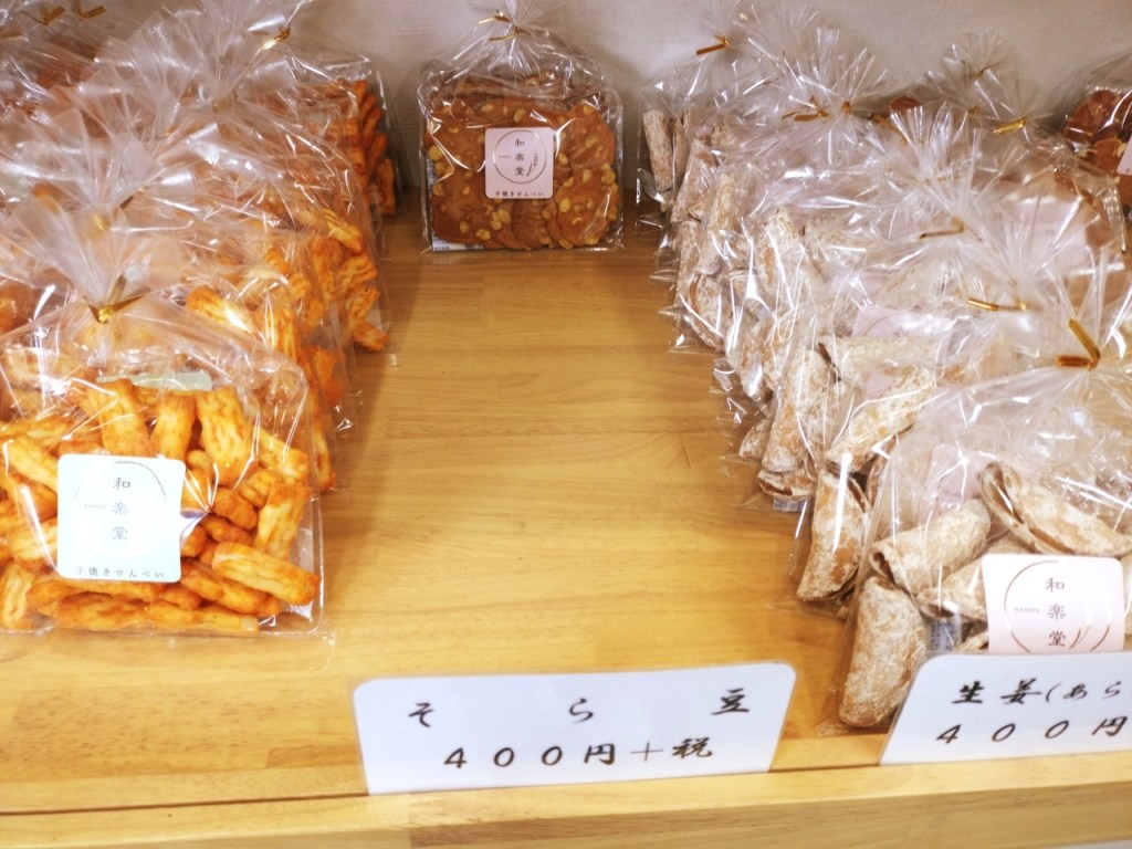 和楽堂では、さまざまな種類のお煎餅が販売されており、ピーナッツやココナッツ、カシューナッツ、アーモンド、あられなどが入ったバラエティ豊かな商品が揃っています。筆者が今回購入したのは「栗煎餅」(税抜400円)と「そら豆煎餅」(税抜400円)。栗煎餅は、白あんを焼いて仕上げられており、口の中でふわっと広がる食感とコクのある甘さが特徴です。そら豆煎餅は、塩気の効いたそら豆と煎餅の生地の甘さが絶妙にマッチし、一度食べたらやみつきになる味わいです。