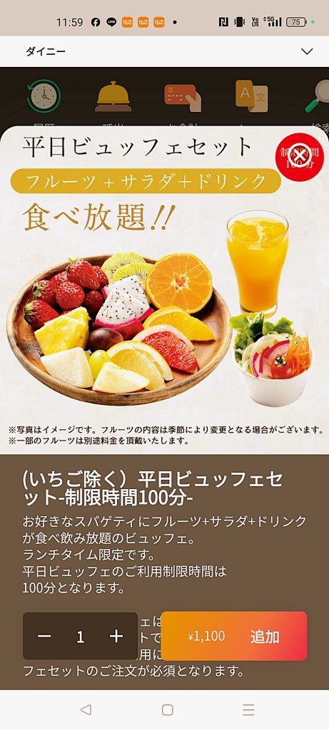 サラダとドリンクも付いて、パスタ代金に+税込1,100円。正直、この内容でこの価格はかなりお得。フルーツ食べ放題はなかなか出会えないので、フルーツ好きにはたまりません。