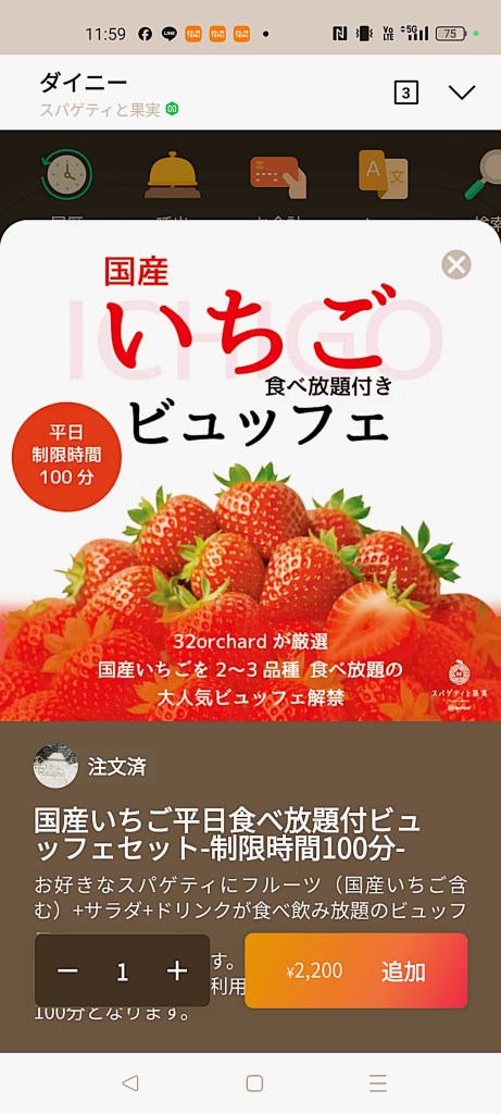 制限時間は100分ですが、メインのパスタや他のフルーツも楽しみつつ、結果的に食べたいちごは28個。十分すぎるほど堪能できました。