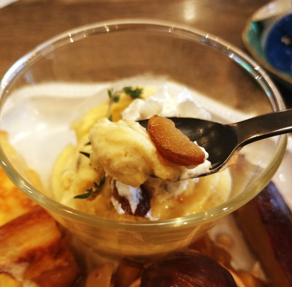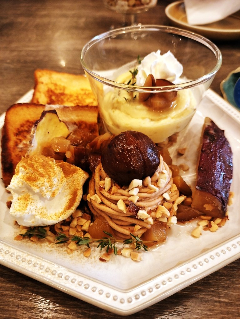 一方、「渋皮栗モンブランと密芋塩バターのスイーツプレート」は、栗の渋皮煮とさつまいもチップを添えたフレンチトーストが目を引きます。フレンチトーストは、Largèならではのふわふわと溶けるような食感が特徴で、ほんのり甘くしっとりとした生地に栗の風味が加わり、食べるたびに秋の香りが口いっぱいに広がります。スイーツプレートには、生スイートポテトやグラノーラも盛り付けられており、どれも秋を感じられる素材で統一されています。とりわけ渋皮栗モンブランは、アーモンドが添えられており、栗の濃厚な味わいと香ばしさが引き立っています。小ぶりながら旨味が凝縮されたフレンチトーストとの相性も抜群で、栗とさつまいもが存分に楽しめる一品です。