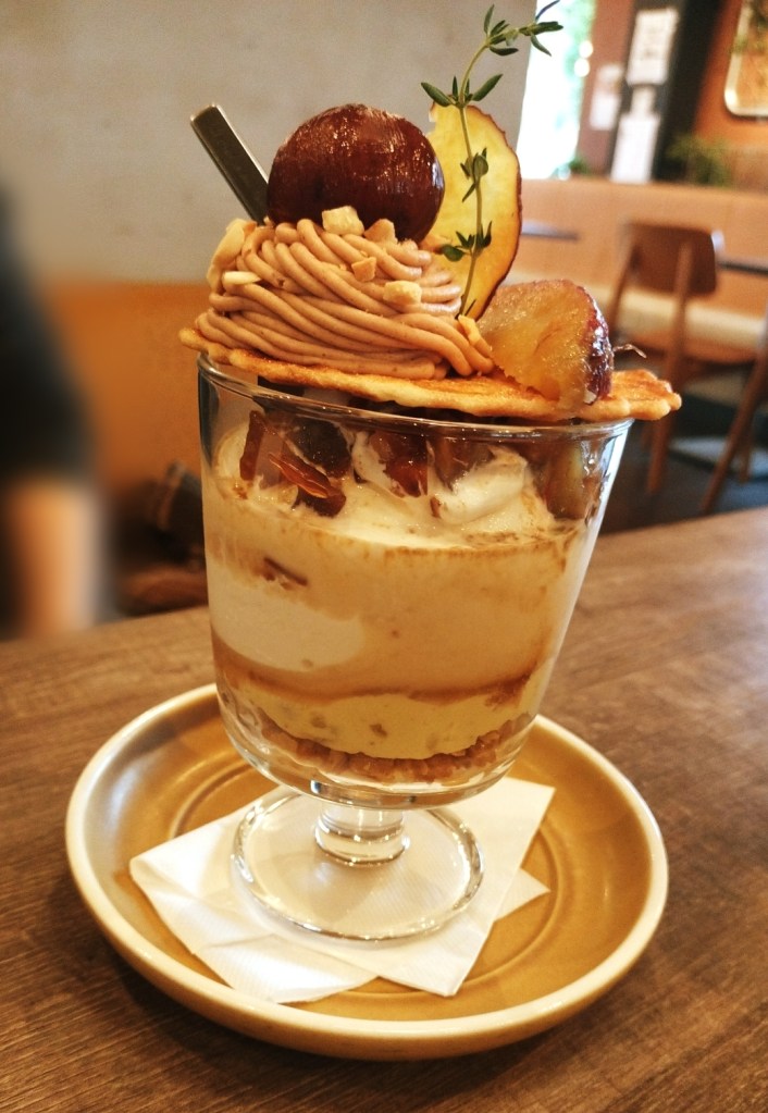 まず、「渋皮栗モンブランと密芋塩バターのパフェ」は、栗の渋皮煮やモンブランクリーム、アーモンド、ホイップクリーム、さつまいもチップ、そして焦がしバターワッフルやほうじ茶パウダーが見た目にも華やかに盛り付けられています。さらに、Largèで人気のミルク感が強めのソフトクリームがたっぷりとトッピングされており、口に含むとまろやかな甘さが広がります。また、蜜芋塩バターと密芋スイートポテトが加えられたことで、さつまいもの自然な甘さが栗の風味を一層引き立てます。グラノーラのサクサク感がアクセントになっており、一口ごとに異なる食感と風味を楽しむことができるパフェです。