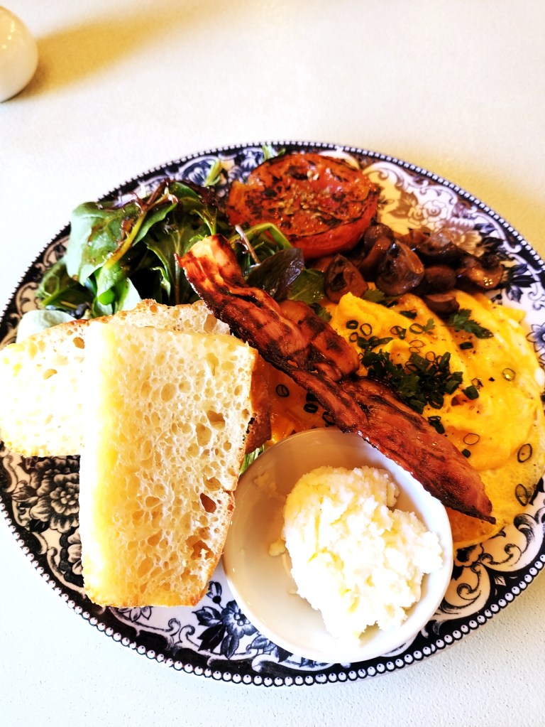 今回は、朝の時間を贅沢に楽しむために「ori cafe」のモーニング「oriプレート」(税込1,518円)をいただきました。メインとなるパンはフォカッチャを選択。プレートには、チーズ、しっとりと焼けた卵焼き、そしてこんがりと焼かれた香ばしいベーコンが添えられています。さらに、サラダにはグリルされたトマトやキノコがトッピングされており、彩りも豊かで視覚的にも楽しめるお洒落な一皿です。