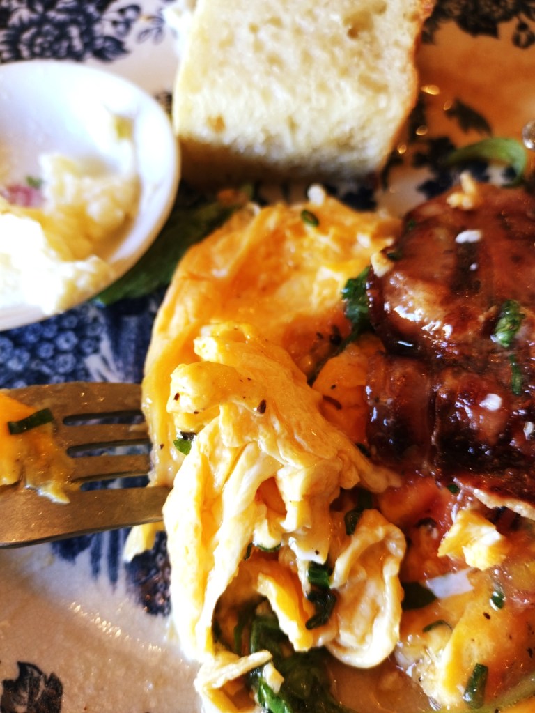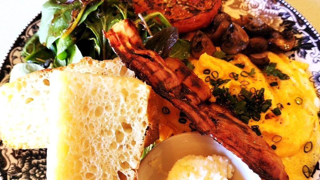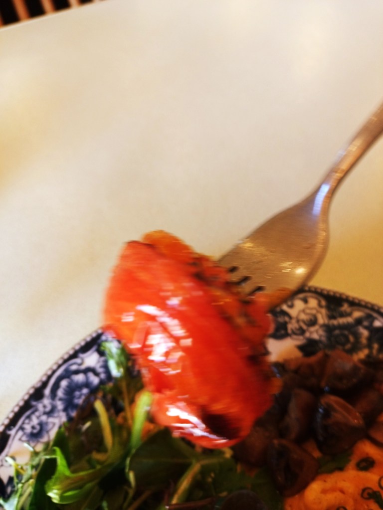 次に、しっとりとした食感の卵焼きと、カリカリに焼かれたベーコンを一緒に頬張ると、それぞれの旨味が口の中で見事に調和し、思わず笑みがこぼれる美味しさです。グリルされたトマトはジューシーで甘みがあり、キノコは香ばしさと味わい深い旨味が楽しめ、サラダ全体のアクセントになっています。