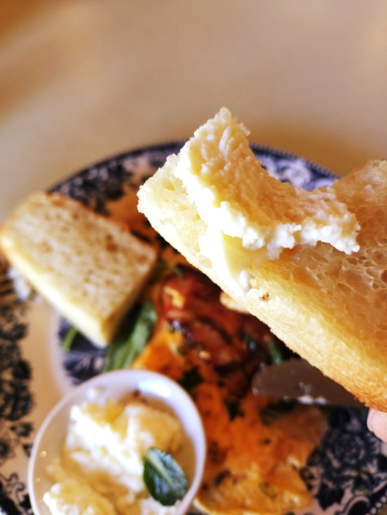 まず、フォカッチャは適度な柔らかさと弾力があり、噛むたびに小麦の香ばしい風味が広がります。そこにチーズをすっと塗っていただくと、芳醇な香りと深いコクが加わり、一層美味しさが増します。