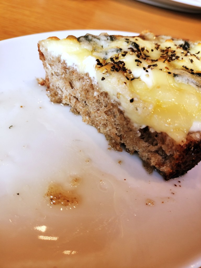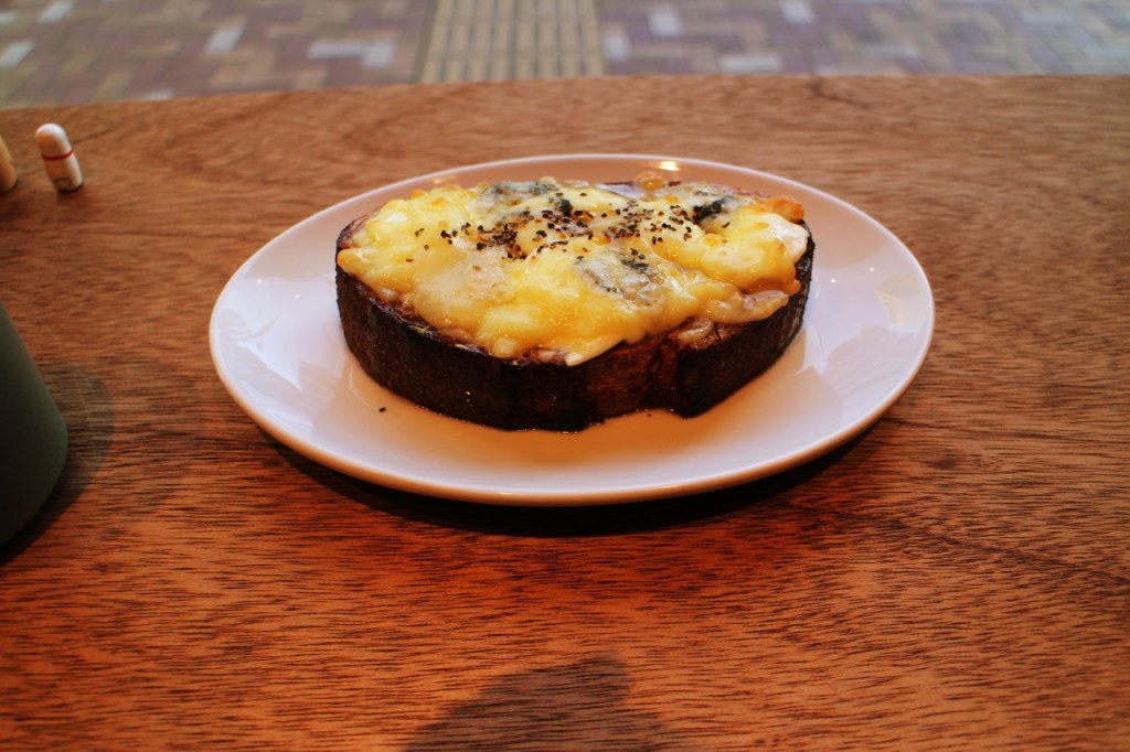 午後3時から提供される「サワードゥブレッド」を使用した一皿は、発酵種から手間ひまかけて作られる特別なパン。ゴルゴンゾーラ、クリームチーズ、シュレッドチーズが贅沢にトッピングされ、さらにハチミツと黒コショウが加わることで、甘じょっぱさがクセになる味わいに仕上がっています。