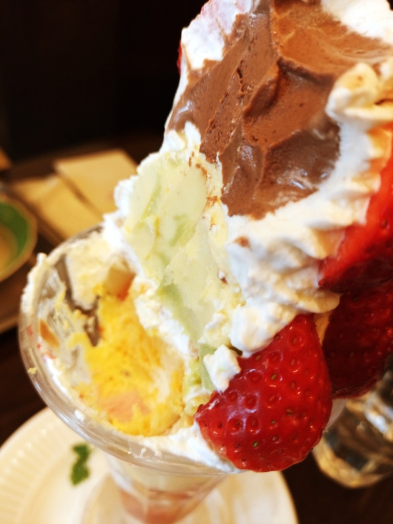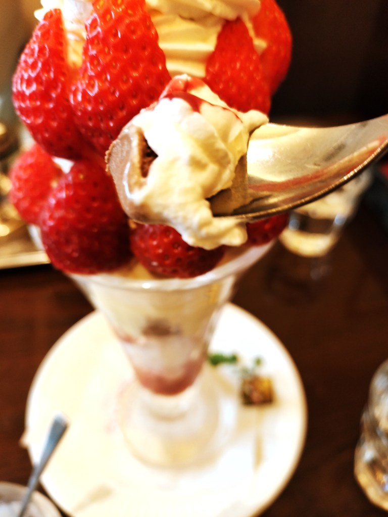パフェの中には3層のアイスが入り、周りをクリームが優しく包み込んでいます。さらに、苺が全面に配置され、見た目も華やかで食べ応え抜群。奥へ進むと、ムースなどの工夫された食材が登場し、最後まで飽きることなく楽しめる仕掛けが施されています。