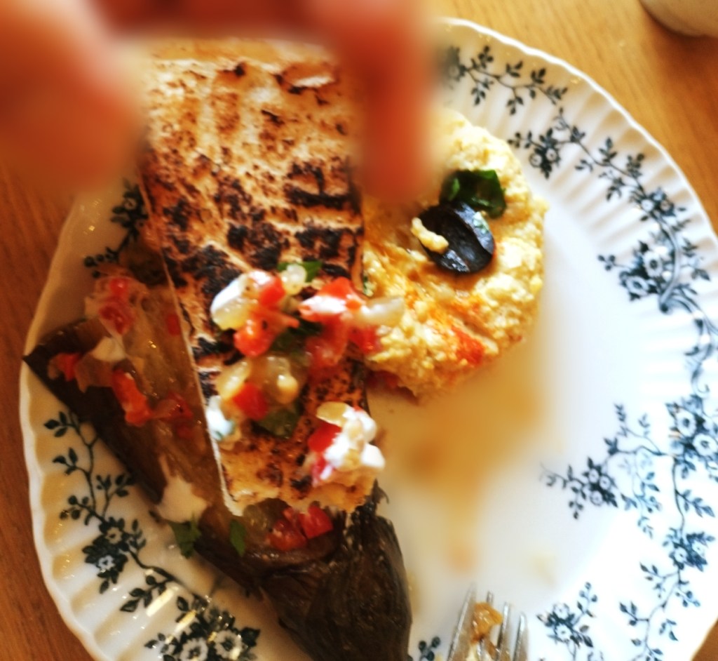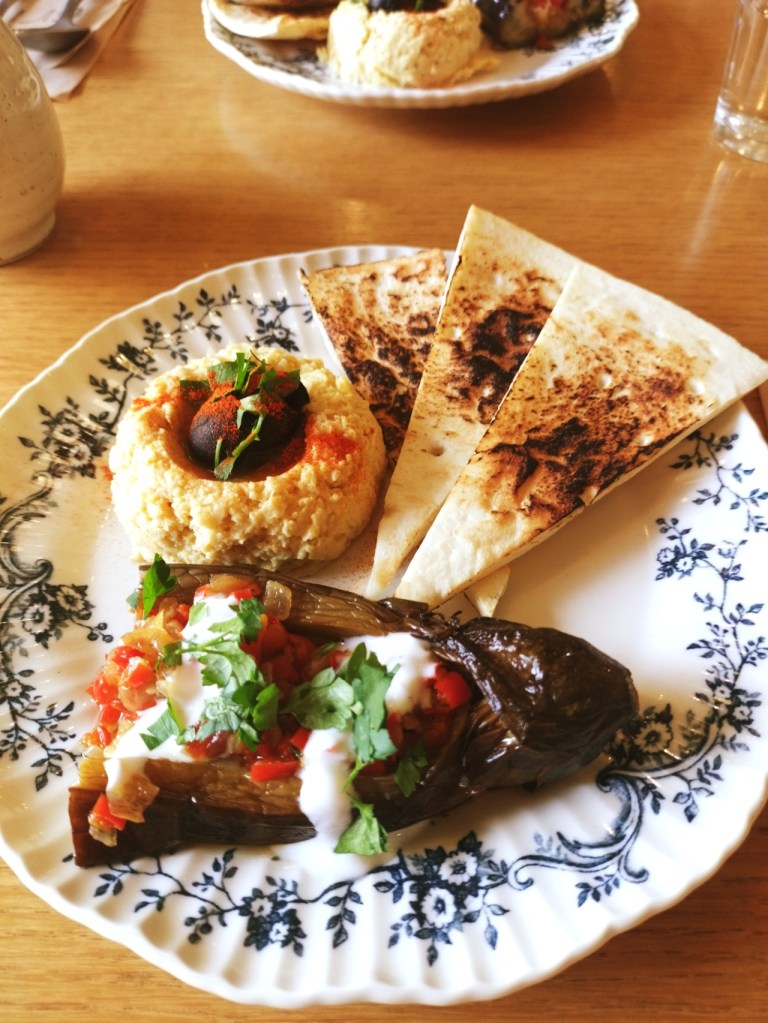 さて気になるコース料理ですが、まず登場するのは、「フムス(ひよこ豆のペーストwithパン)」と「イマムー(トルコ風ナスの冷製揚げ浸し)」。フムスはイスラエルをはじめとする中東で親しまれる料理で、ひよこ豆の優しい風味が特徴。付け合わせのパンにつけていただくと、まろやかさとさっぱり感が口いっぱいに広がります。一方、イマムーはナスにしっかり味が染み込んだ冷製の一品。これもパンに合わせて楽しむことで、異国情緒漂う前菜を存分に味わえます。