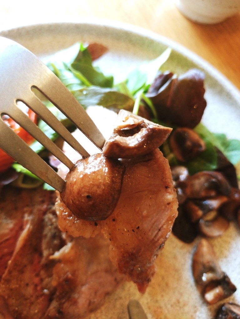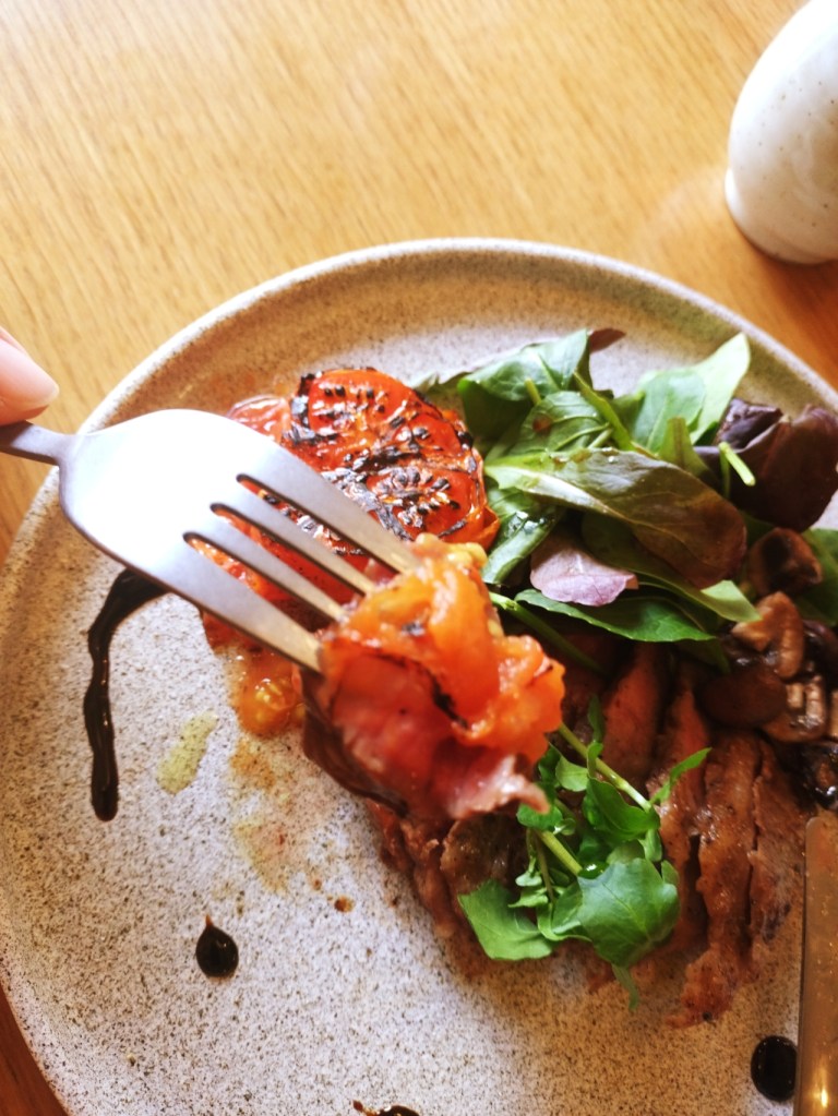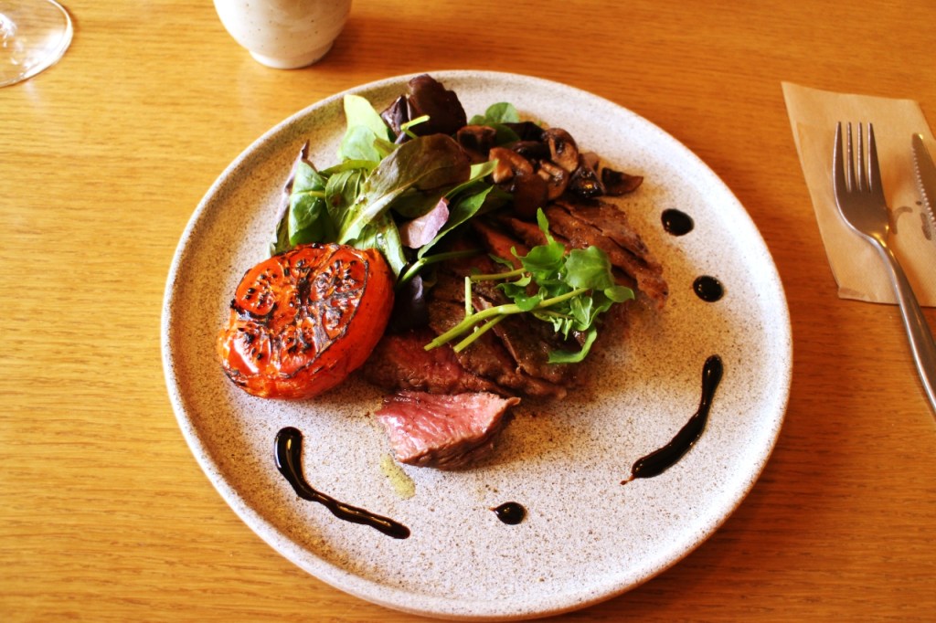メインは、希少部位の牛リブキャップステーキ。1頭から約1kgしか取れない赤身の旨味がぎゅっと詰まった肉を、濃厚なバルサミコソースとともにいただきます。グリルされたトマトやマッシュルームを一緒に食べることで、素材本来の味わいが引き立ちます。お肉自体の味付けはシンプルで、使用されている岩塩が旨味をさらに引き出しています。弾力がありながら柔らかく、ジューシーな食感は何度でも食べたくなる味わいでした。