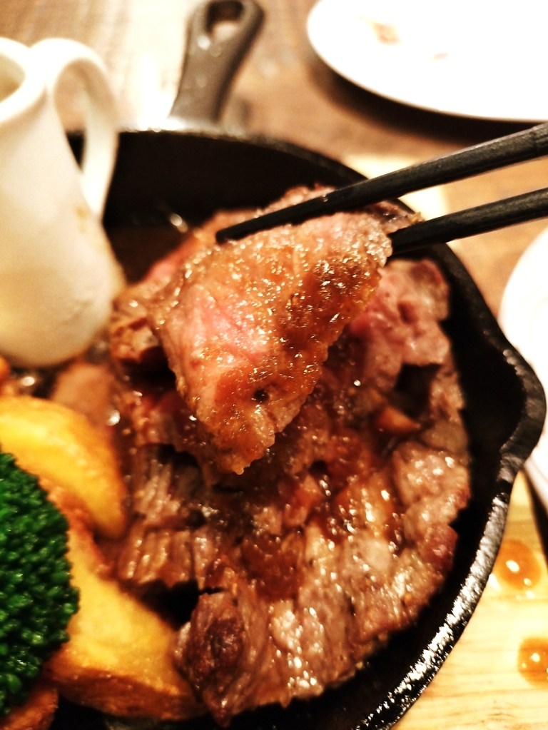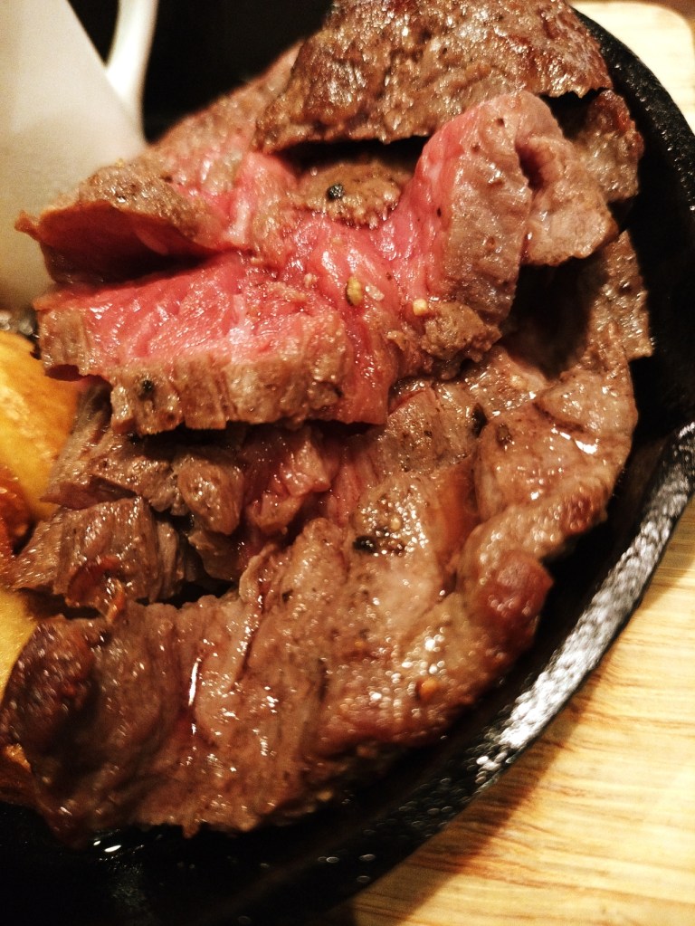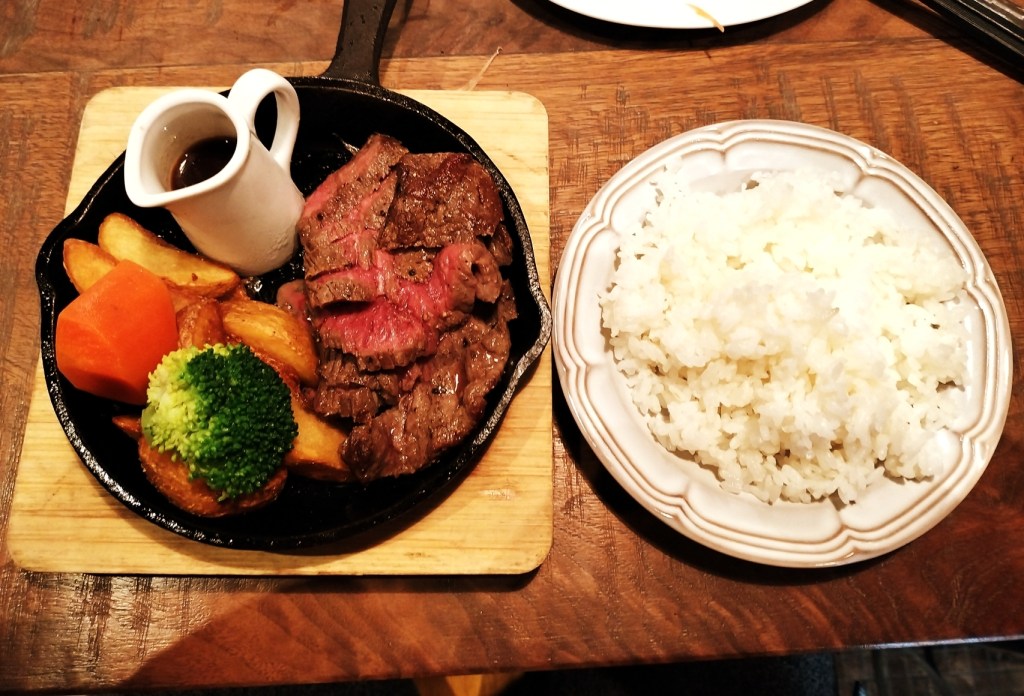 鉄板のスキレットで提供されるリブロースステーキは、焼き立ての香ばしい香りが食欲をそそります。赤身が多めの肉質ながら、驚くほど柔らかく、噛むほどに肉の旨味が広がります。焼き加減も絶妙で、表面は香ばしく中はジューシー。ソースはしっかりとお肉に絡み、ごはんとの相性も抜群です。