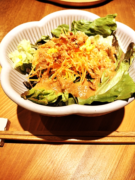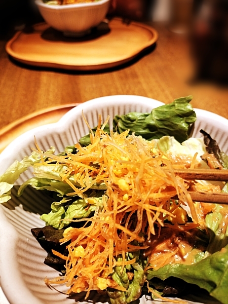まず運ばれてきたのは、どちらのメニューにも付いてくるサラダ。これが一品料理として出てきてもおかしくない完成度の高さでした。特に印象的だったのは、人参の繊細な千切りとやさしい味付け。シャキシャキとした食感の中に、じんわりとした甘味と酸味が感じられ、まさに“新感覚”。主役のハンバーグを引き立てつつも、しっかりと存在感のある前菜です。