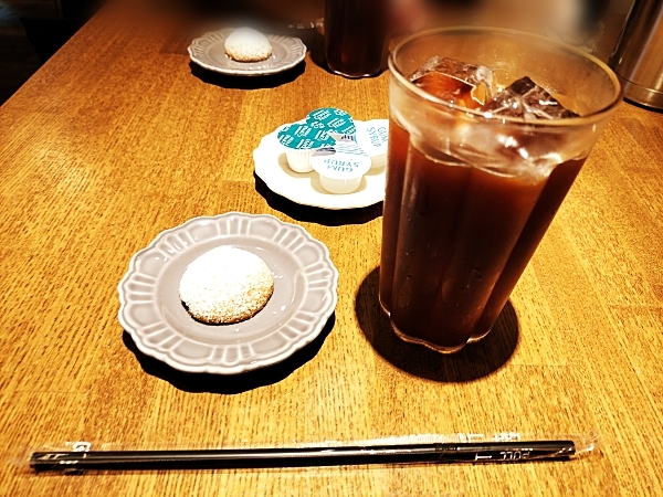 コーヒーには、なんとスノーボールが添えられていました。ひとくちサイズの焼菓子で、卵ボーロのようにサクッと軽く、それでいて甘くてしっとり。どこか懐かしさを感じさせる、優しい味わいのデザートでした。ドリンクにちょこんと添えられているのに、思わず笑顔になるような心づかいです。