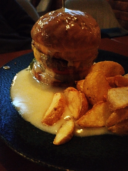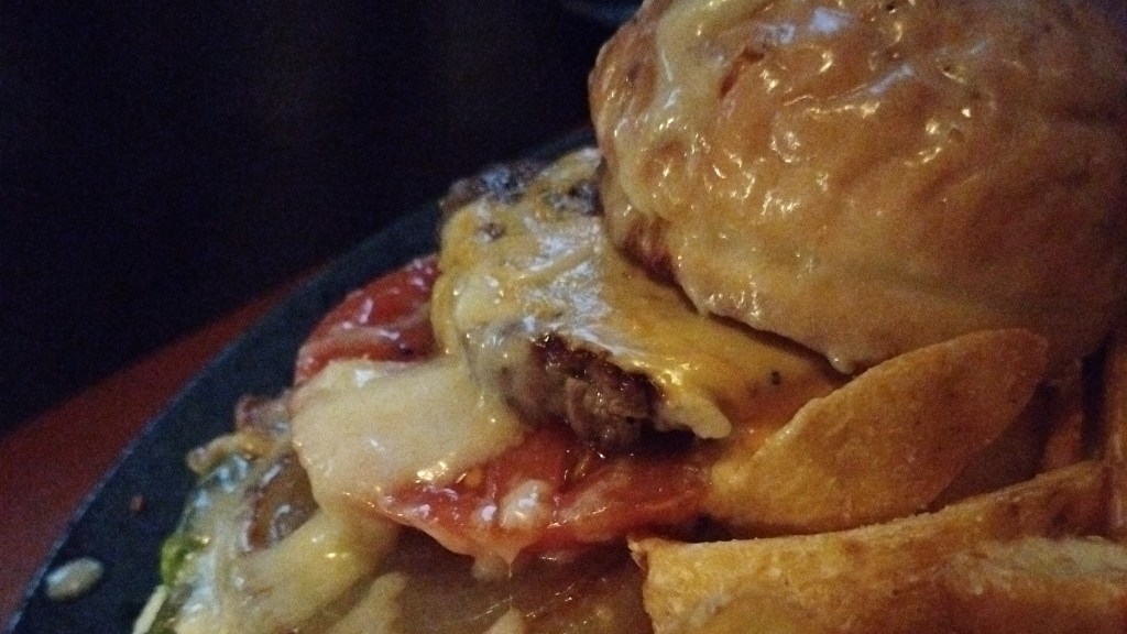 まずは圧倒的な存在感を放つ「ダイナミックチーズバーガー」。テーブルに運ばれた瞬間、溢れんばかりのとろけるチェダーチーズが目を奪います。まるでチーズの滝──その圧巻のビジュアルに思わずナイフとフォークを手に取り、じっくり味わうことに。