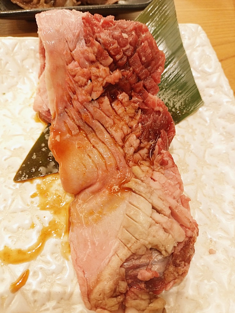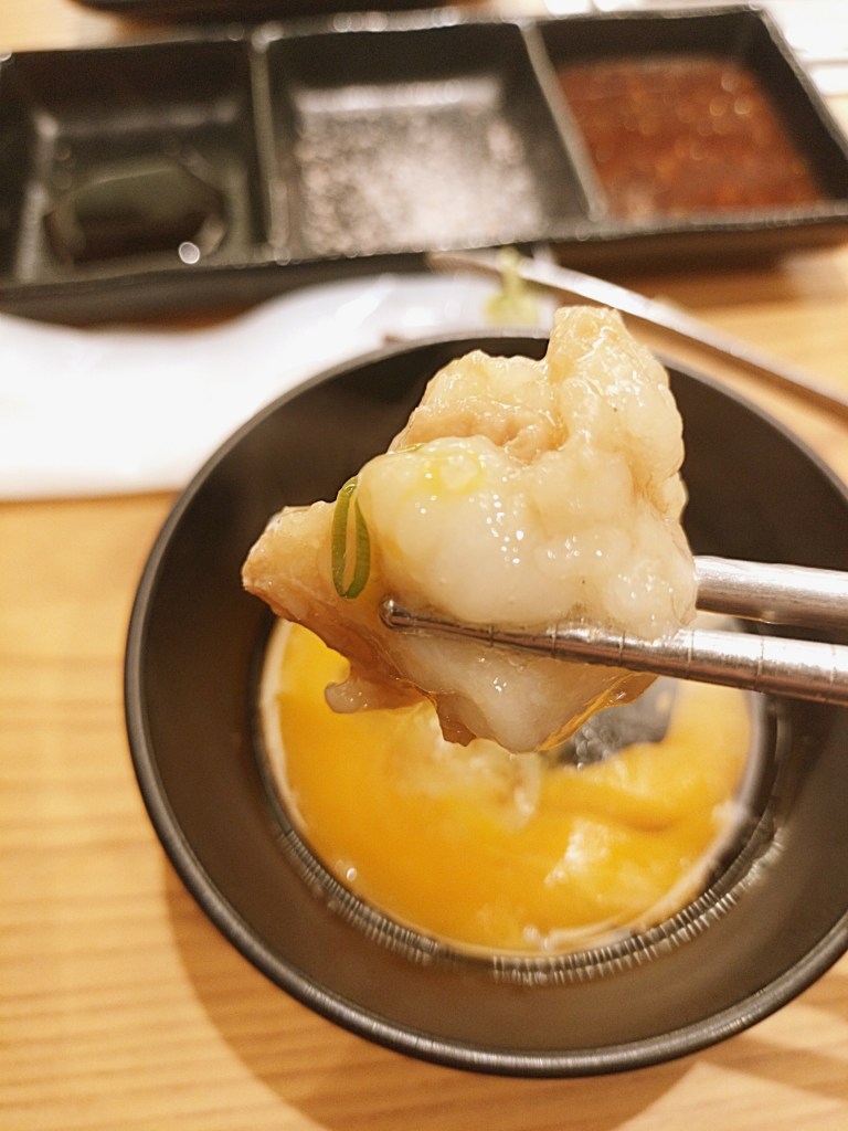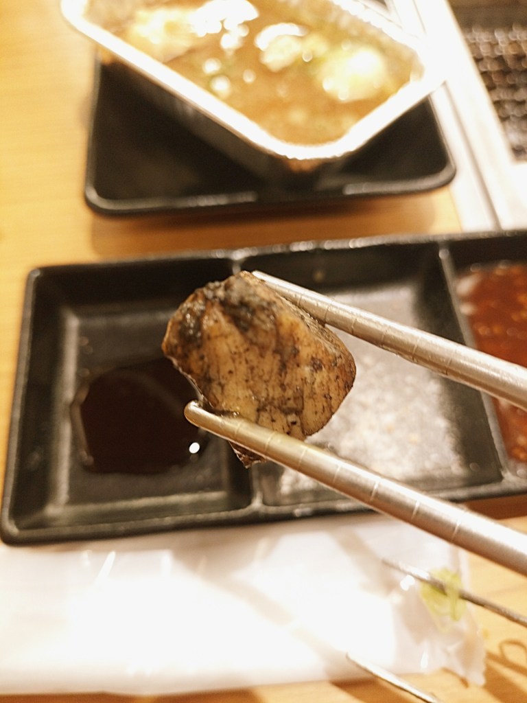 そして、「やみつき大トロホルモン」は想像以上の旨さ。ぷるぷるの食感、噛み応え、そして脂のコクのバランスがとにかく良く、味付けも濃すぎず、それでいてしっかりとした深みがあります。クセになる、というのはまさにこのこと。焼くと皮がカリッと香ばしくなり、噛むごとにじゅわっと口に広がる濃厚な脂がたまりません。