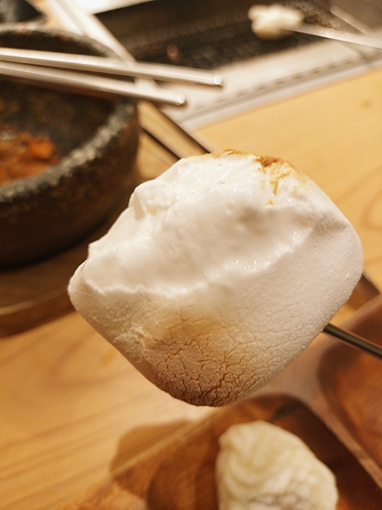 食後はデザートで締め。タブレットからプリンやジェラートを注文できるだけでなく、自分でマシュマロやたい焼きを焼いて楽しむことも可能。焼きマシュマロはふんわりと膨らみ、外はカリッと中はとろけるような触感に変化。まるで生クリームのようななめらかさで、ついつい何個も手が伸びます。