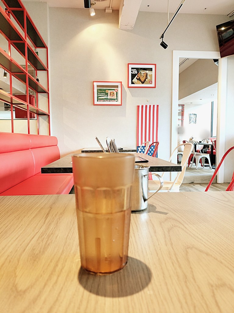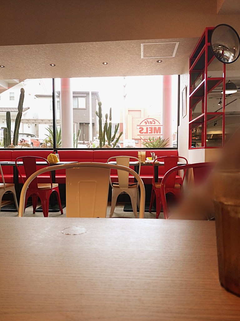 お昼どきに訪れた「カフェメルス猪子石店」は、扉を開けた瞬間から熱気に包まれていました。広い店内いっぱいにお客さんの笑い声や食器の音が響き、まるで映画に出てくるアメリカンダイナーのよう。壁にはカラフルなポスターやポップな装飾が並び、テーブルや椅子のレイアウトもゆったりしていて、居心地の良さが漂っています。