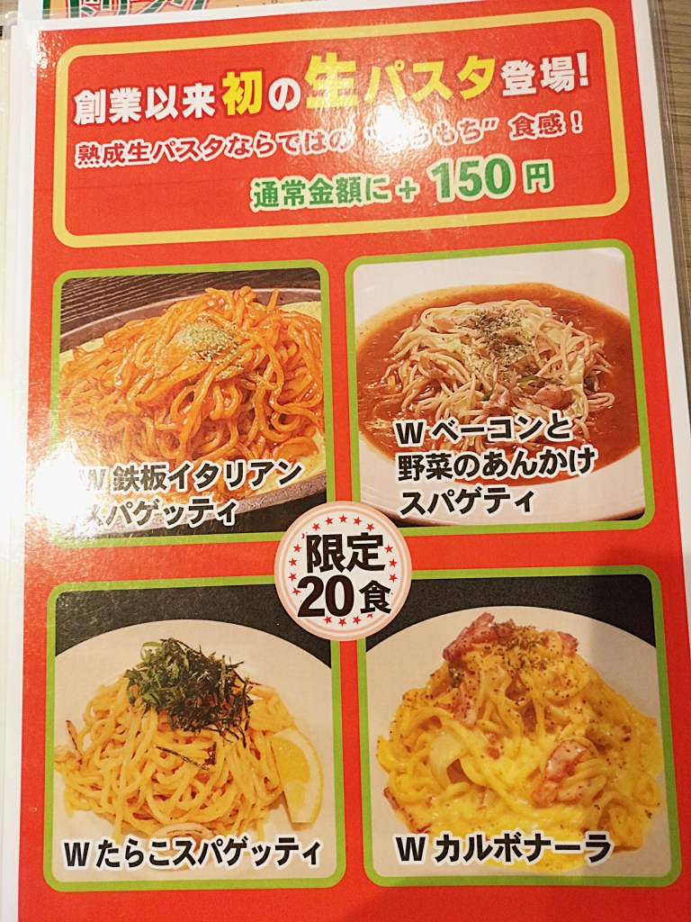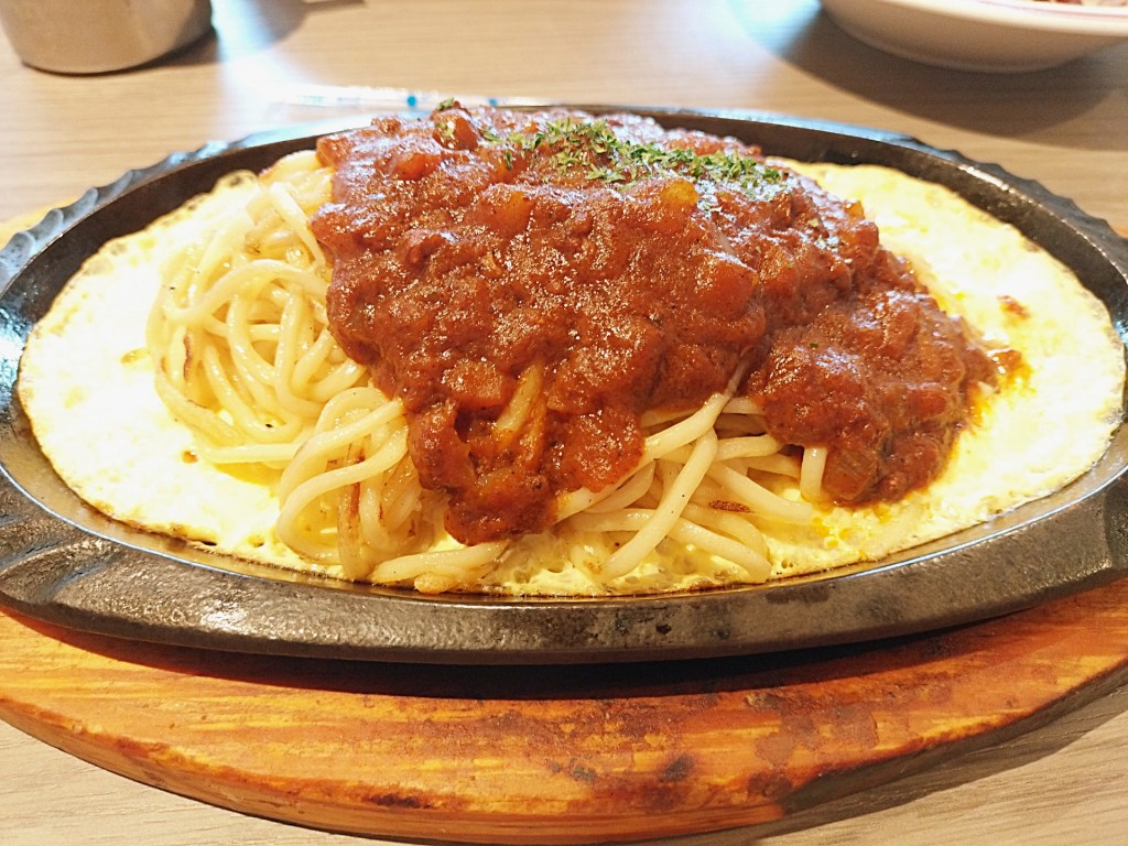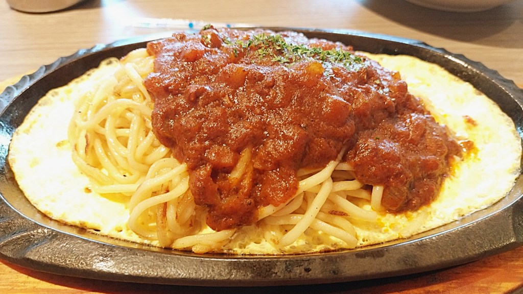 次に登場したのは、この店の人気メニュー「鉄板ミートスパゲティ」。しかも今回は、限定20食の生パスタ(+税込150円)をチョイス。鉄板の上でまだジュウジュウと音を立てながらやってきます。