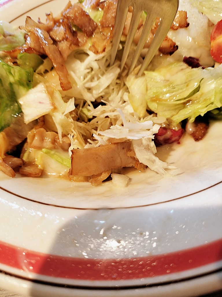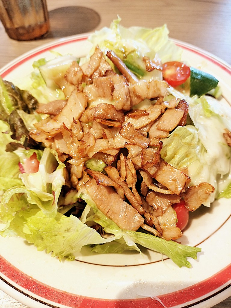 前菜代わりに選んだメルスサラダは、運ばれてきた瞬間からボリューム感に驚かされます。大きな皿に山盛りのレタス、その上にトマトやキュウリが彩りを添え、さらにじっくり焼かれたベーコンが全体を覆っています。フレンチドレッシングが野菜一つひとつを包み込み、酸味と旨味のバランスが絶妙。ベーコンの香ばしさがアクセントになり、口に運ぶたびに次のひと口が待ち遠しくなるサラダです。
