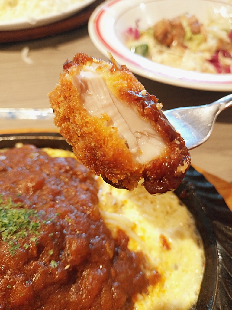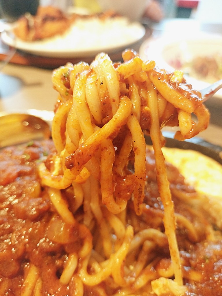 フォークで麺を巻き取ると、もちもちとした弾力が指先に伝わってきて、その瞬間からもう美味しい予感。口に入れると、しっかりとした小麦の風味と、コク深いミートソースの旨味が絡み合います。ほんのり甘く、それでいて後味は軽やか。どこか懐かしい喫茶店の味わいを残しつつも、今風に整えられた絶妙なバランスです。最後のひと口まで熱々で食べられるのも鉄板ならでは。