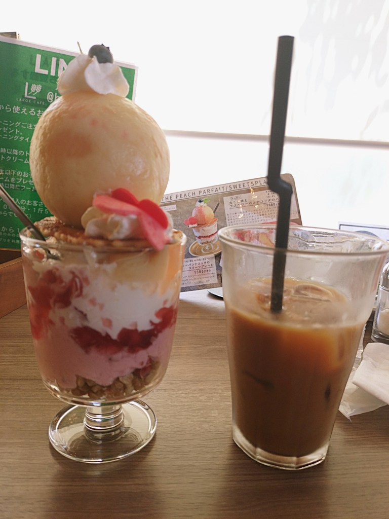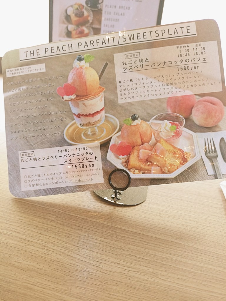 モーニングでしっかりエネルギーをチャージした後、まだ時間があったので、もうひとつのお楽しみである季節限定メニューにも挑戦することに。現在提供されているのは、旬の桃を使ったスイーツです。