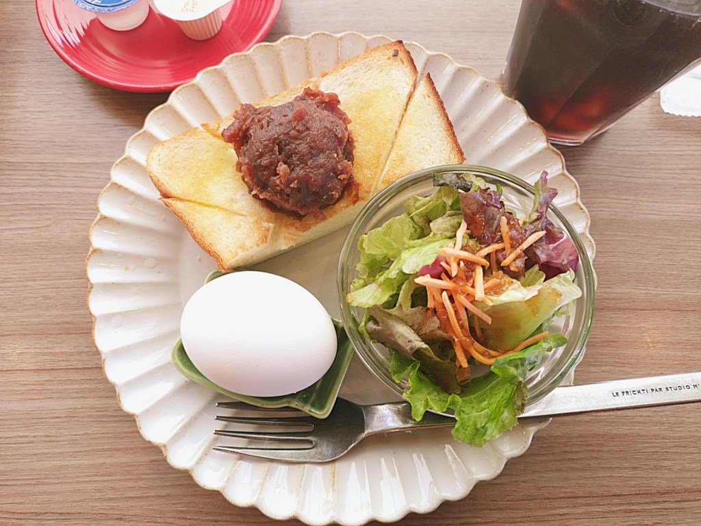 モーニングには厚切りトーストとゆで卵が付くのが基本スタイル。今回はそこにプラス(税込230円)して、小倉とサラダを追加しました。