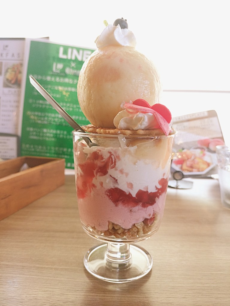 グラスの中には、自家製の桃コンポート、濃厚なミルクソフトクリーム、ローズヒップとカシスのジュレ、ラズベリーパンナコッタ、そして香ばしいグラノーラが層をなしています。