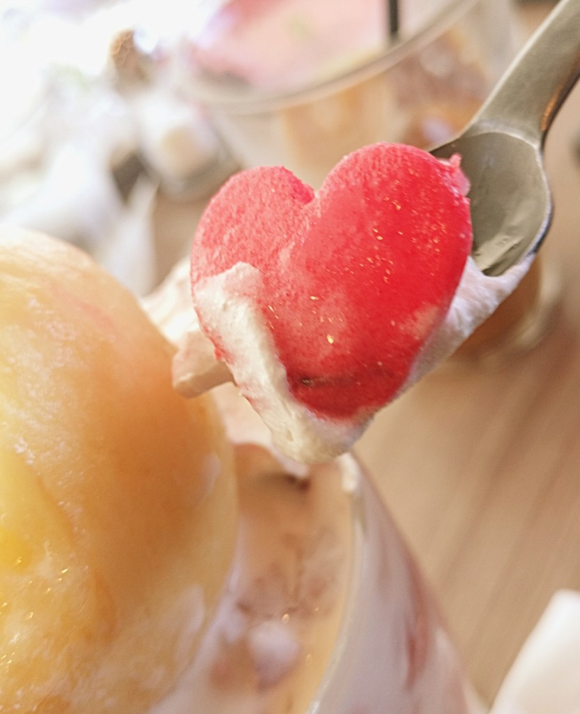 桃の横には、ハート型のマシュマロフォンダントが添えられており、見た目の可愛らしさだけでなく、ふんわりとした食感とやさしい甘さでパフェ全体にアクセントを加えています。