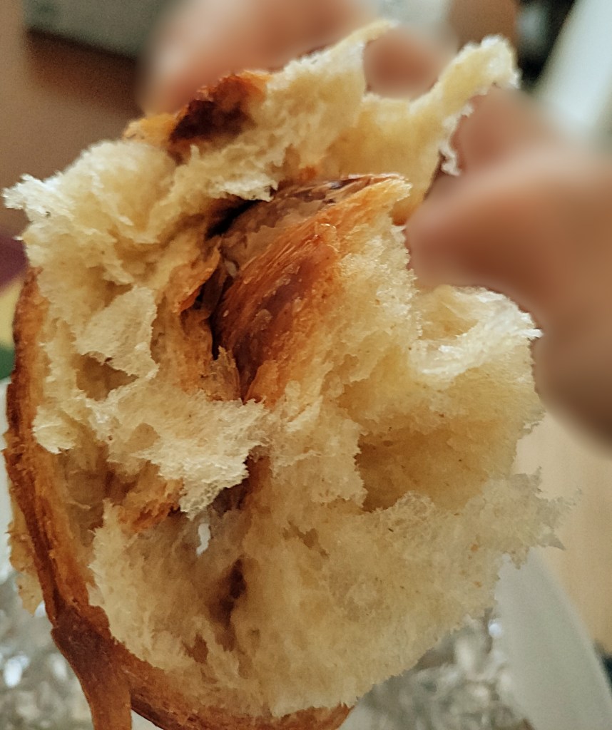 手に取ると、まずその重量感に驚かされます。クロワッサンと聞くと軽やかなイメージを持つ方も多いと思いますが、このクロワッサンは“ずっしり”とした存在感。外はカリッと香ばしく、中はぎっしりと詰まった生地が特徴です。ひとつ食べればお腹がしっかり満たされるほどのボリュームで、まさに主役級のパンといえます。