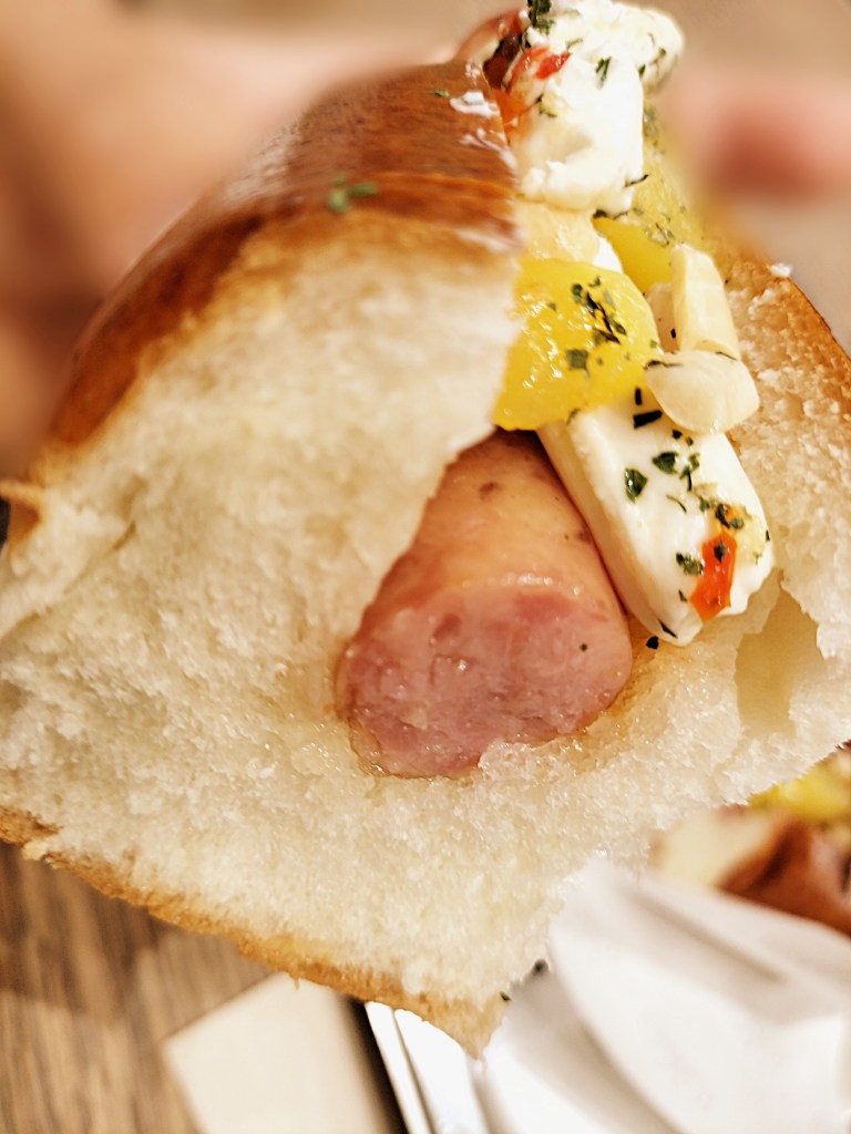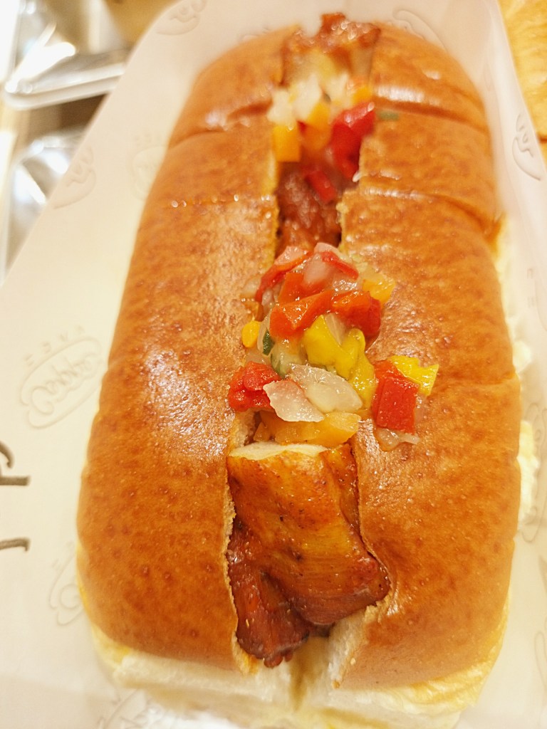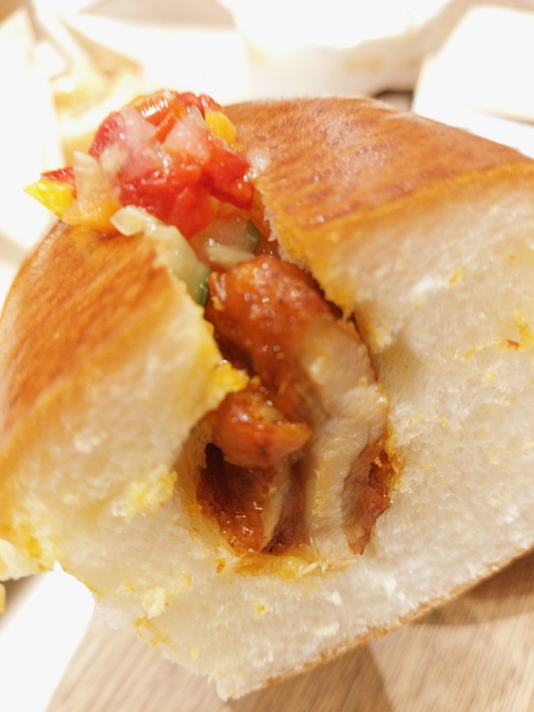 次にいただいたのは「ごろっとマンゴー×スイートチリドッグ ~サワークリーム~」(税込690円)。正直、メニュー名を見たときは「ホットドッグにマンゴー?」と少し戸惑いました。ところが食べてみて驚愕。マンゴーの濃厚な甘みとスイートチリの辛味が、絶妙なバランスで調和しているのです。そこにサワークリームが加わることで全体がまろやかになり、後味はすっきり。甘さと辛さがシーソーのように行き来する、まさに“高度な合わせ技”。予想を超えた美味しさに、思わず頷いてしまいました。