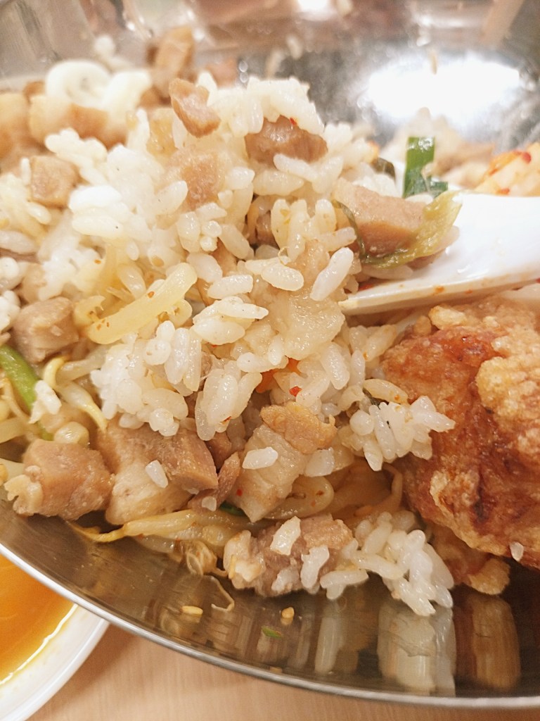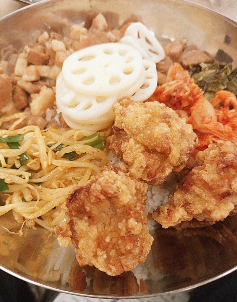 大きめの器いっぱいに盛られたご飯の上には、ナムルやキムチ、高菜、から揚げ、レンコンなど、色とりどりの具材がてんこ盛り。