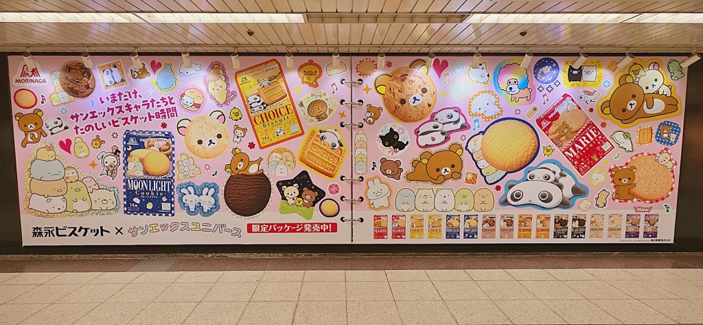 先日、名古屋駅を訪れた折に、駅前の大型屋外広告「グランドボード」に掲出された「森永ビスケット × サンエックスユニバース」コラボの巨大グラフィックを目にして、思わず足を止めてしまいました。昭和・平成・令和と長年にわたって親しまれてきた森永のお菓子と、リラックマやすみっコぐらし、たれぱんだといった人気キャラクターたちが、子ども時代の“シール帳”をモチーフとしたデザインでひとつに集結している――そのインパクトは、まさに圧倒的でした。