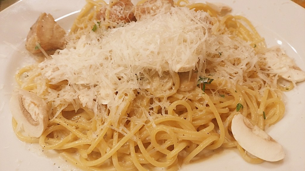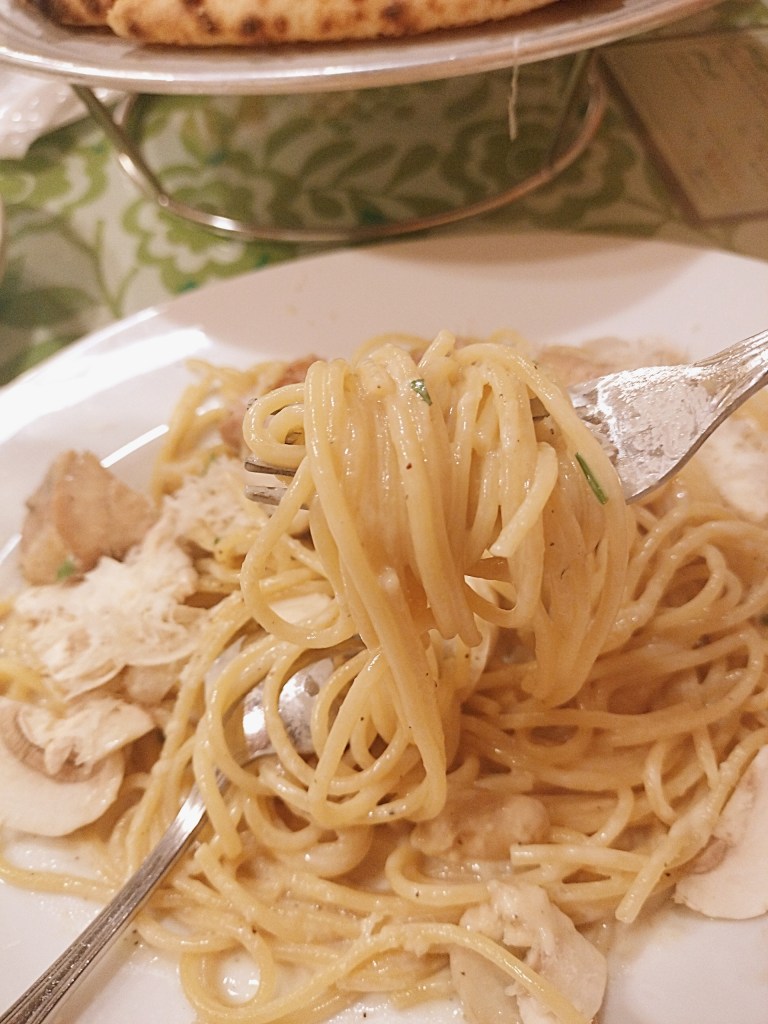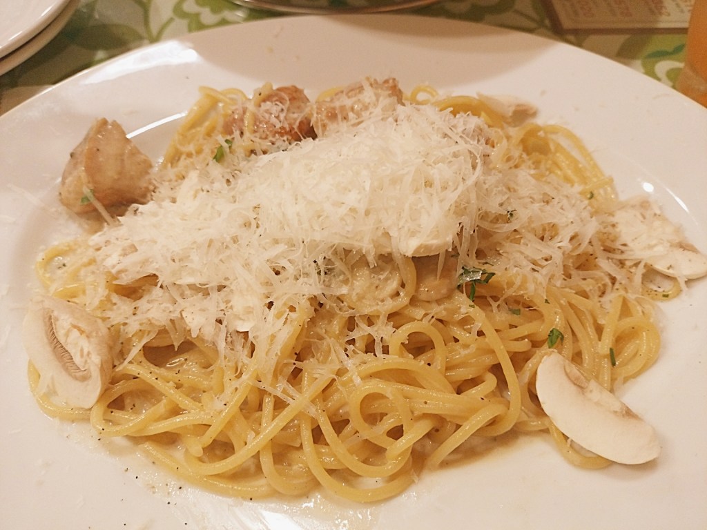 まず運ばれてきたのは、湯気とともにふんわりと立ちのぼるチーズとマッシュルームの香り。見た目からして濃厚そうなクリームソースが、もちもちのパスタにしっかり絡んでいます。ひと口食べた瞬間、まろやかなソースの中に感じるパルミジャーノのコクと香ばしさ。そして、レモンペッパーチキンの爽やかな酸味とスパイスが絶妙なアクセントになっています。