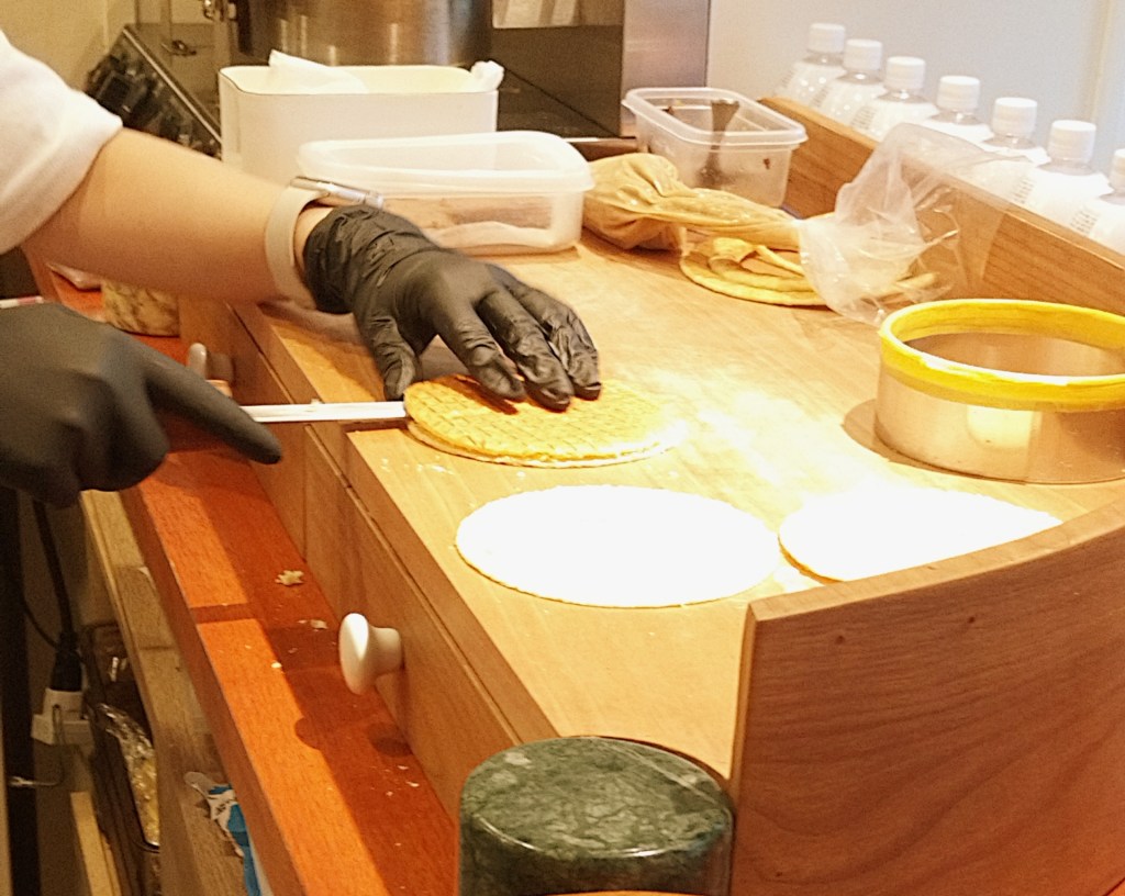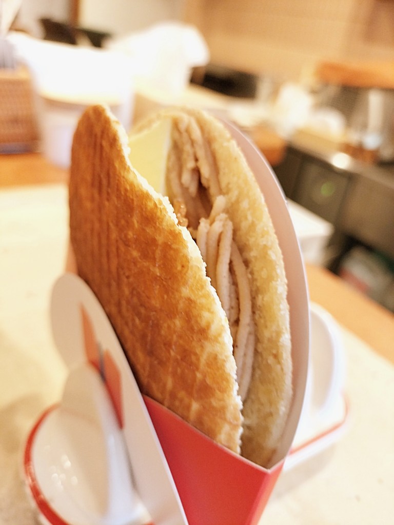 一瞬「これは本当にワッフル?」と疑ってしまうような、どこか「新種の煎餅」のようにも感じられる新感覚スイーツでした。栗煎餅のような食べやすさと、焼きたてワッフルならではの軽やかさが共存していて、従来のストロープワッフルのイメージを良い意味で裏切ってくれます。正直、これはリピートしたくなる美味しさです。