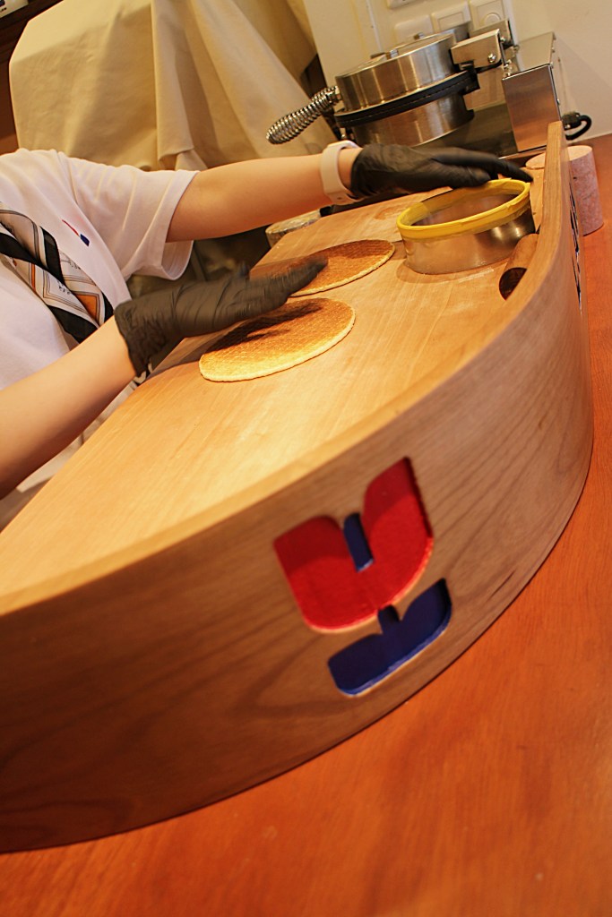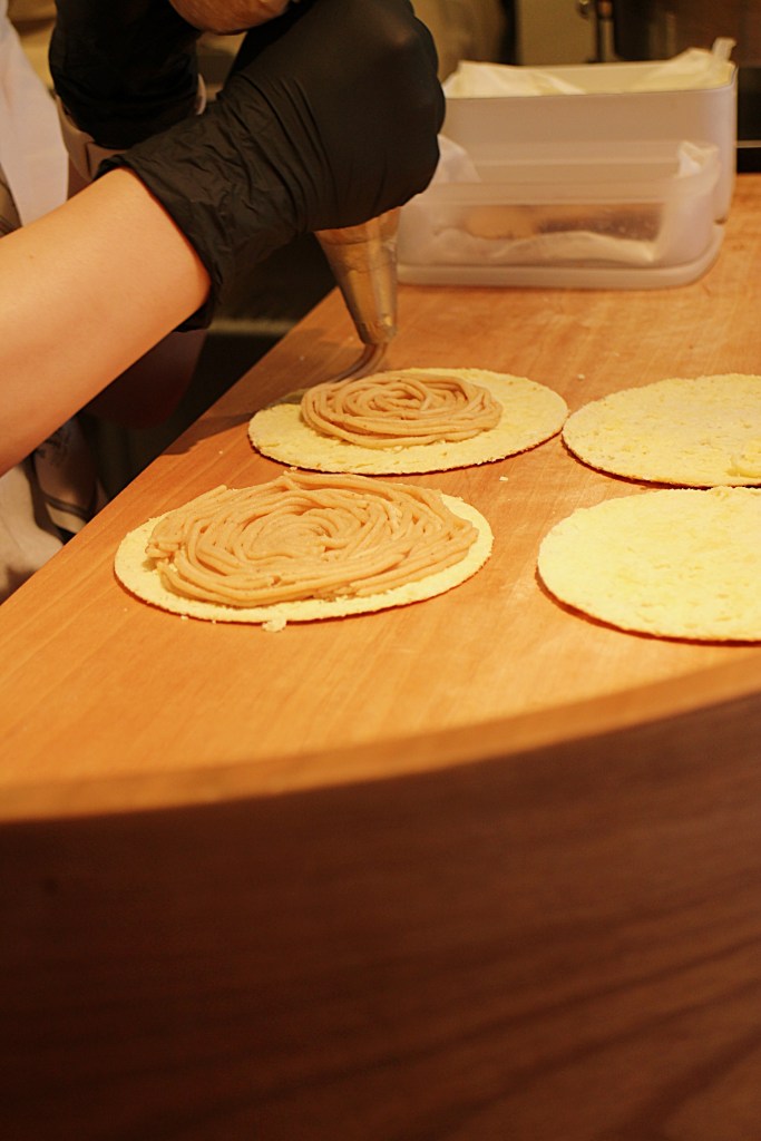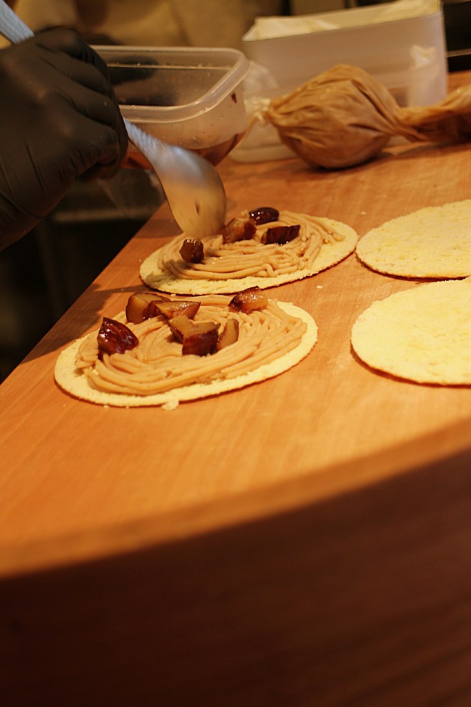 まず目を奪われたのは、その制作工程。注文が入ると、スタッフが目の前で1枚1枚丁寧に生地を焼き上げていきます。鉄板に広がる香ばしい甘い香りに包まれる中、焼きあがった生地を素早く半分にスライス。驚くほど薄く仕上げられたワッフルに、たっぷりの国産和栗ペースト、そしてモンブランクリームとこだわりのバターをトッピングしていきます。