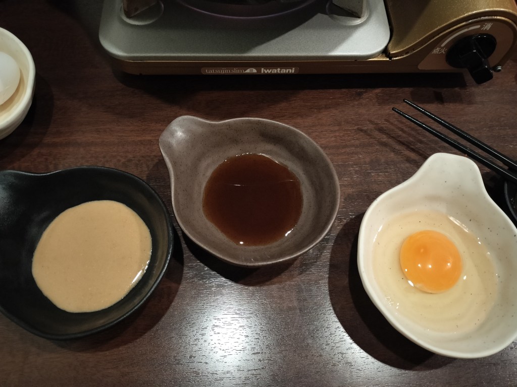 薬味は卵、ポン酢、ごまだれに加え数種が添えられ、味変しながら楽しめる贅沢仕様。