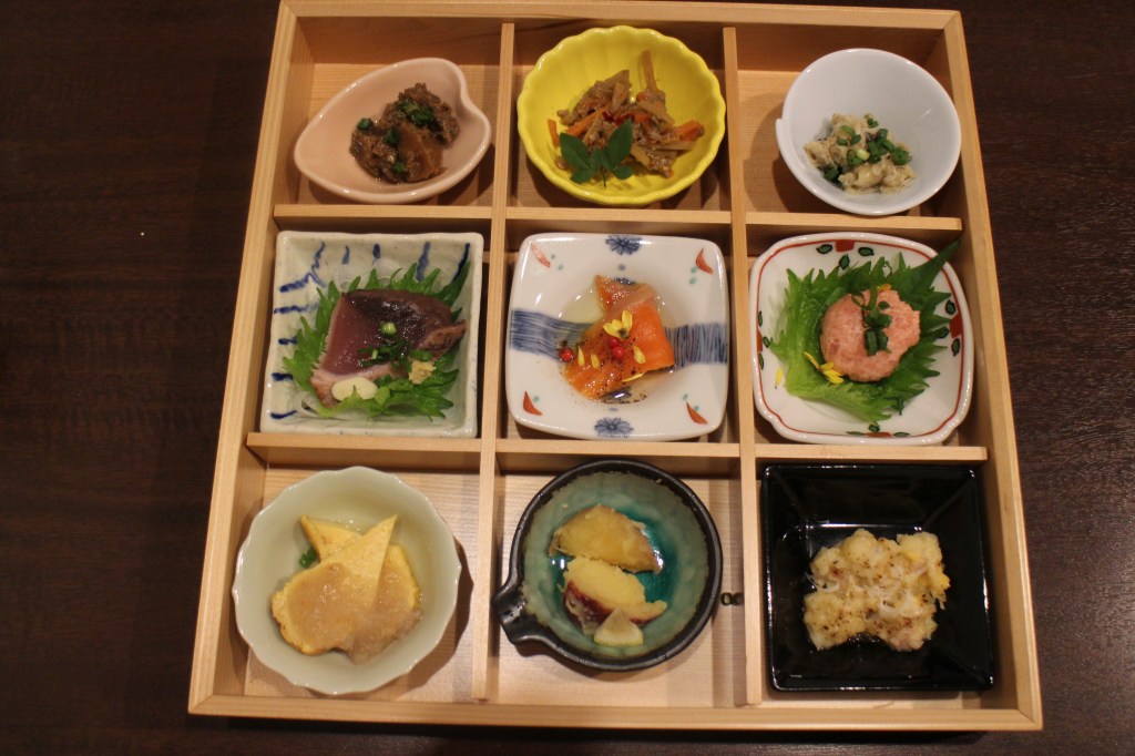 最初に登場するのは、9種の前菜盛り合わせ。一皿に多彩な味が並び、まるで宝石箱だ。うなぎ、サーモン、ネギトロ、鰹…好きなものが次々と現れ、口の中が華やかに賑わう。中でも印象的だったのは、大人向けに仕上げられたポテトサラダ。クリーミーなのにしつこさがなく、素材の良さが控えめに主張する。