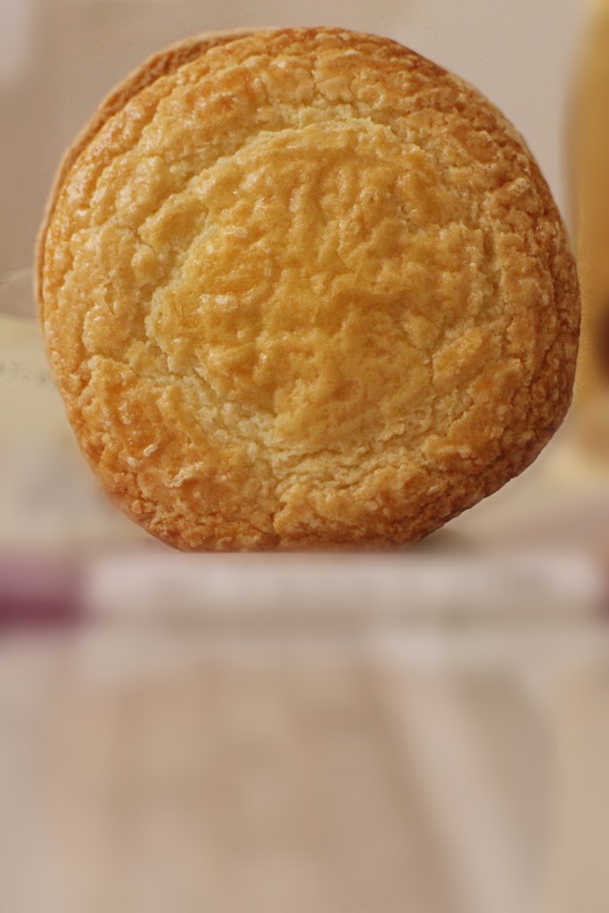 まず手に取って感じるのは、その存在感。直径は約7cmとコンパクトながら、しっかりとした厚みがあり、見た目以上にずっしりとしています。外側はクッキー生地で、月餅という名前から想像する“和菓子”のイメージとは少し違い、どこか洋菓子の雰囲気も漂わせています。