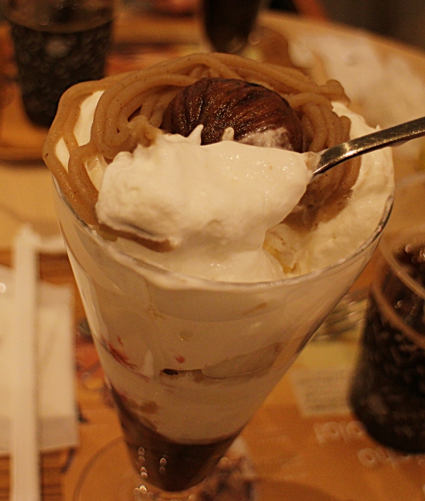 まずスプーンを入れて感じるのは、全体を包み込むようなクリーミーさ。ソフトクリームやバニラアイスのなめらかな口当たりが広がり、その直後に渋皮栗のモンブランあんの濃厚な甘みが追いかけてきます。栗の風味はしっかりと感じられますが、甘さは決して重くなりすぎず、上品にまとめられているのが印象的です。