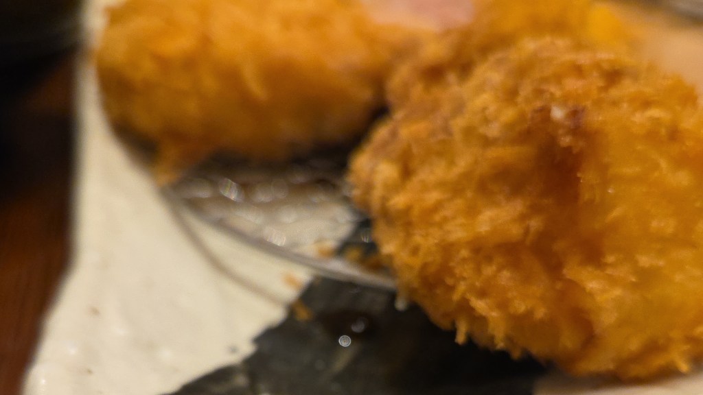そして楽しみにしていた帆立クリームコロッケ。箸で割った瞬間、とろっとしたクリームが顔を出して、ちょっとテンションが上がります。一口食べると、外はサクサク、中はなめらかで濃厚。でもくどさはなく、やさしいコクが広がる感じ。その中に、ゴロッと入った帆立の存在感がしっかりあって、「あ、ちゃんと主役だ」と思わせてくれます。クリームと帆立の組み合わせってやっぱりいいな、としみじみ。