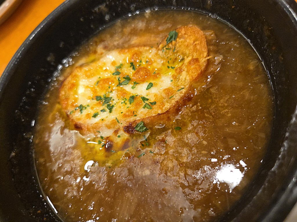 そして今回の主役とも言えるのが「たまねぎのズッパ(税込300円)」。スプーンを入れた瞬間にわかる、じっくり煮込まれた玉ねぎのとろとろ感。飴色になるまで炒められた甘みがスープ全体に溶け込み、口に運ぶたびにじんわりとした優しい旨みが広がります。スープを吸ったパンと、とろけたチーズの組み合わせは王道ながら完成度が高く、軽食とは思えない満足感。どこか上品さすら感じさせる一皿で、価格を忘れるほどのクオリティでした。
