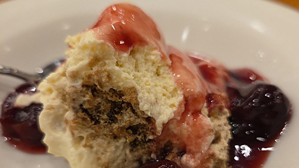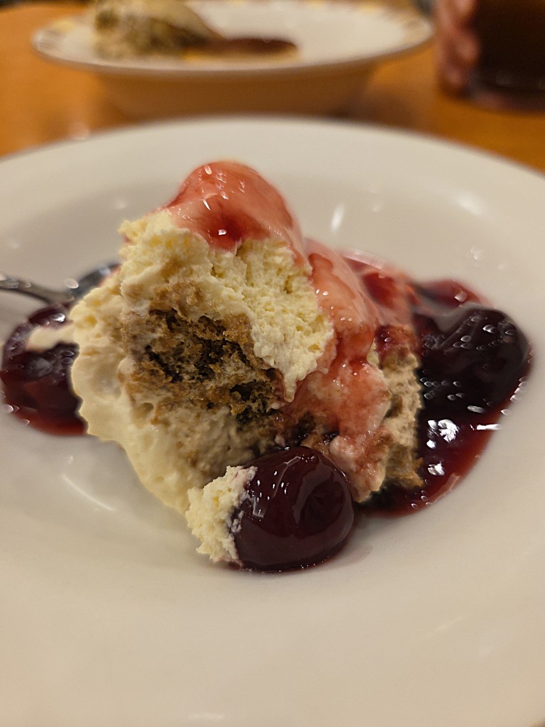 デザートには期間限定のチェリーソースのティラミスを。マスカルポーネのコクに、甘酸っぱいチェリーソースが絶妙に重なり、濃厚でありながら後味は軽やか。イタリアで親しまれている“アマレーナ”を思わせる味わいで、いつものティラミスとはひと味違う上品さを楽しめます。しっかり甘いのに重すぎない、このバランスがクセになります。